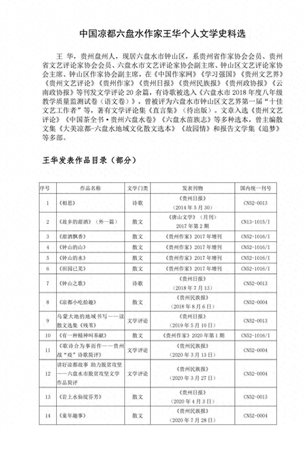 王 华,贵州盘州人,现居六盘水市钟山区,系贵州省作家协会会员、贵州省文艺评论家协会会员、六盘水市文艺评论家协会副主席、钟山区文艺评论家协会主席、钟山区作家协会副主席,在《中国作家网》《学习强国》《贵州文艺界》《贵州文艺评论》《贵州作家》《贵州日报》《贵州民族报》《贵州政协报》《云南政协报》等刊发文学评论20余篇,著有文学评论集《直言集》(待出版)。有诗歌被选入《六盘水市2018年度八年级教学质量监测试卷(语文卷)》,曾被评为六盘水市钟山区文艺界第一届“十佳文艺工作者”等,文章入选《贵州文艺评论》《中国茶全书·贵州六盘水卷》《六盘水苗族志》等多种选本,主编散文集《大美凉都-六盘水地域文化散文选本》《故园情》和报告文学集《追梦》等多部。